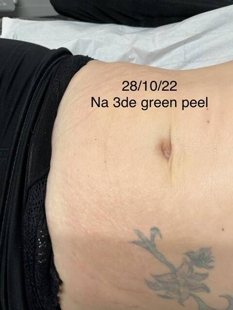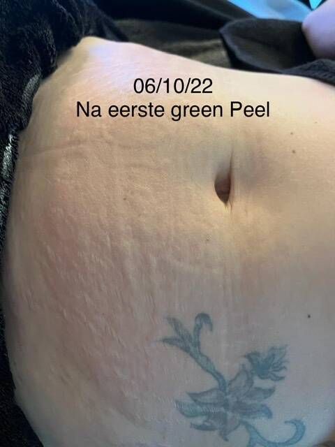 ’Na mijn zwangerschappen bleven er redelijk wat striemen achter. Gelukkig kon Saar helpen. Door de green peel werden de striemen niet enkel fijner, de huid er rond werd ook terug een pak strakker. Het resultaat was zo goed dat ik het zelfvertrouwen had om mijn tattoo bij te werken en uit te breiden.’